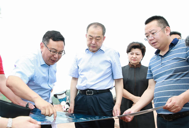 在雅安無水港鳳鳴物流園項目場平施工現(xiàn)場,蘭開馳聽取了項目業(yè)主交建集團黨委書記、董事長漆家華的工作匯報,詳細了解無水港物流項目規(guī)劃、建設(shè)進展、業(yè)態(tài)布局等情況。