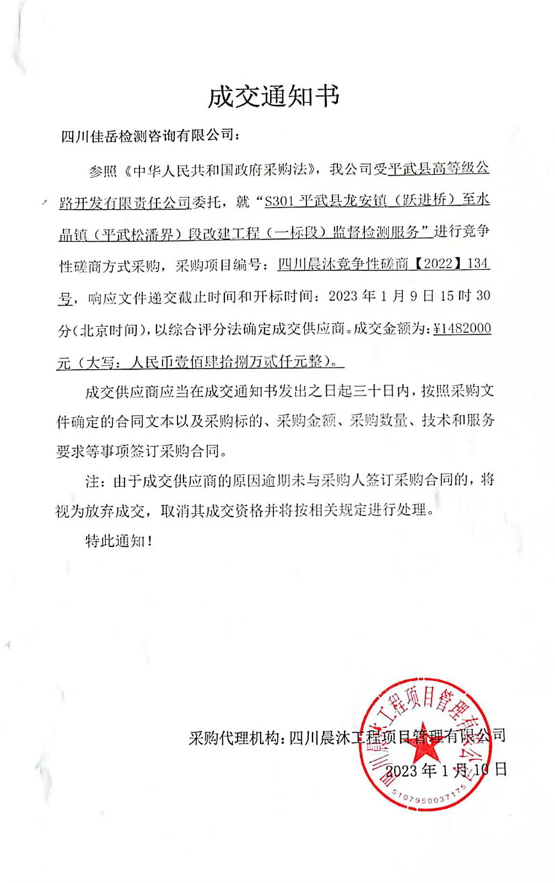 中標(biāo)項目為S301平武縣龍安鎮(zhèn)(躍進(jìn)橋)至水晶鎮(zhèn)(平武松潘界)段改建工程(一標(biāo)段)監(jiān)督檢測服務(wù)項目,成交金額148萬余元。此次成功中標(biāo)展示了公司的檢測能力和市場競爭力,為公司“走出去”積極承攬市外、省外業(yè)務(wù)增添信心。