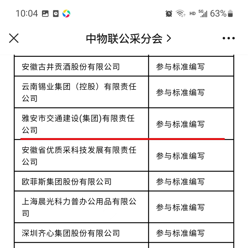 4月20日,由中國物流與采購聯(lián)合會批準立項,中國物流與采購聯(lián)合會公共采購分會牽頭編制,中國物流與采購聯(lián)合會團體標準化技術委員會歸口的團體標準《國有企業(yè)采購操作規(guī)范》正式發(fā)布,雅安市交通(建設)集團有限公司是本次團體標準起草組成員單位中全國唯一一家地級市屬國有企業(yè)平臺公司。