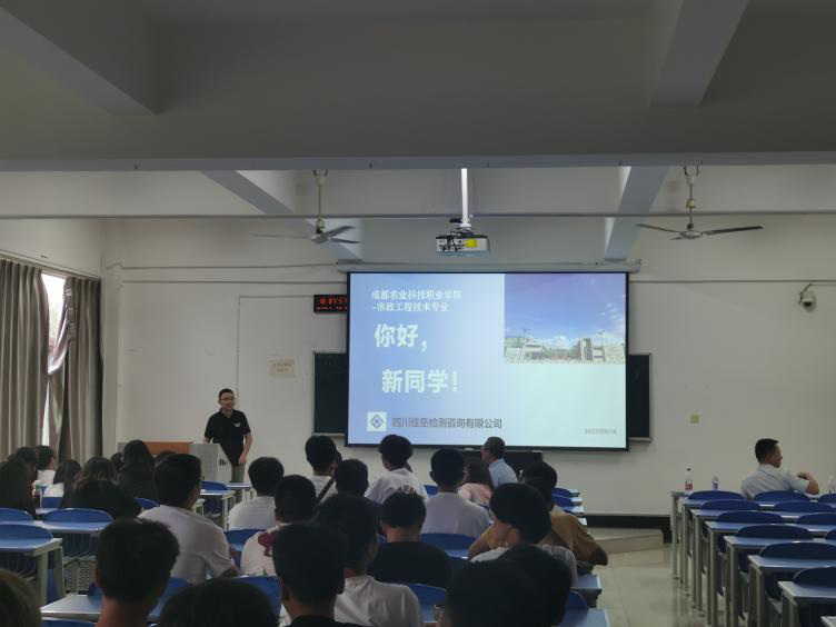為深化校企合作,促進合作內容全面落實落地、交流融合,近日,交建集團四川佳岳檢測公司應邀參加成都農業(yè)科技職業(yè)學院城鄉(xiāng)建設學院市政班入學專業(yè)教育分享會。佳岳公司檢測技術部工程師侯濤在會上作分享交流。