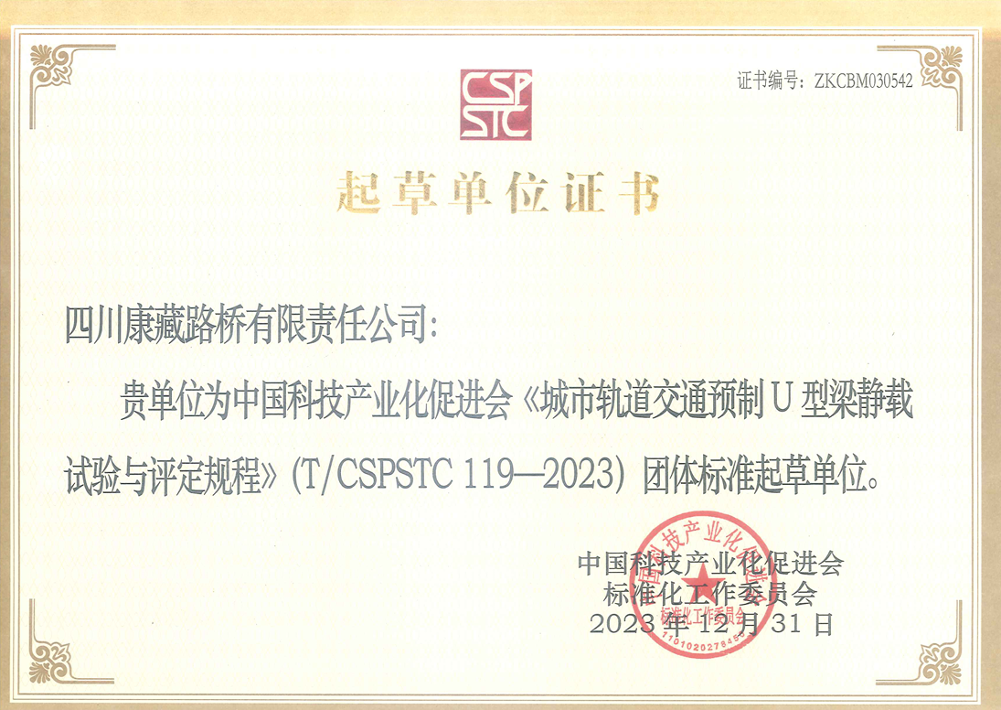 日前,雅安市交通建設(shè)(集團)有限責任公司收到中國科技產(chǎn)業(yè)化促進會頒發(fā)的《城市軌道交通預(yù)制U型梁靜載試驗與評定規(guī)程》(T/CSPSTC119-2023)團體標準起草單位證書,路橋公司參與起草的《城市軌道交通預(yù)制U型梁靜載試驗與評定規(guī)程》團體標準,于2023年12月31日正式發(fā)布實施。