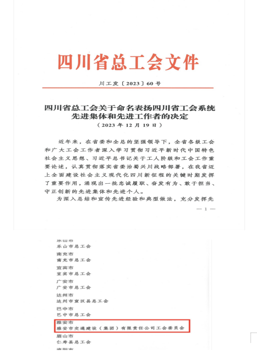 12月19日,四川省總工會將雅安市交通建設(shè)(集團(tuán))有限責(zé)任公司工會委員會命名表揚(yáng)為“四川省工會系統(tǒng)先進(jìn)集體”。