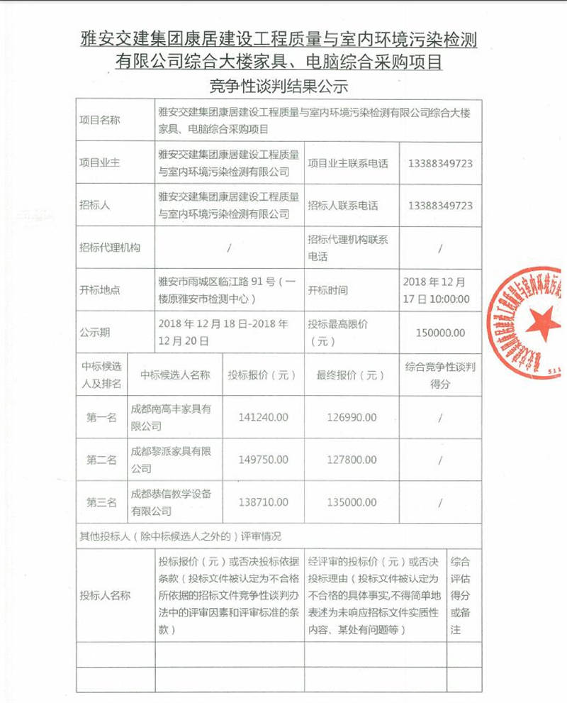 綜合大樓家具、電腦綜合采購項目競爭性談判結(jié)果公示
