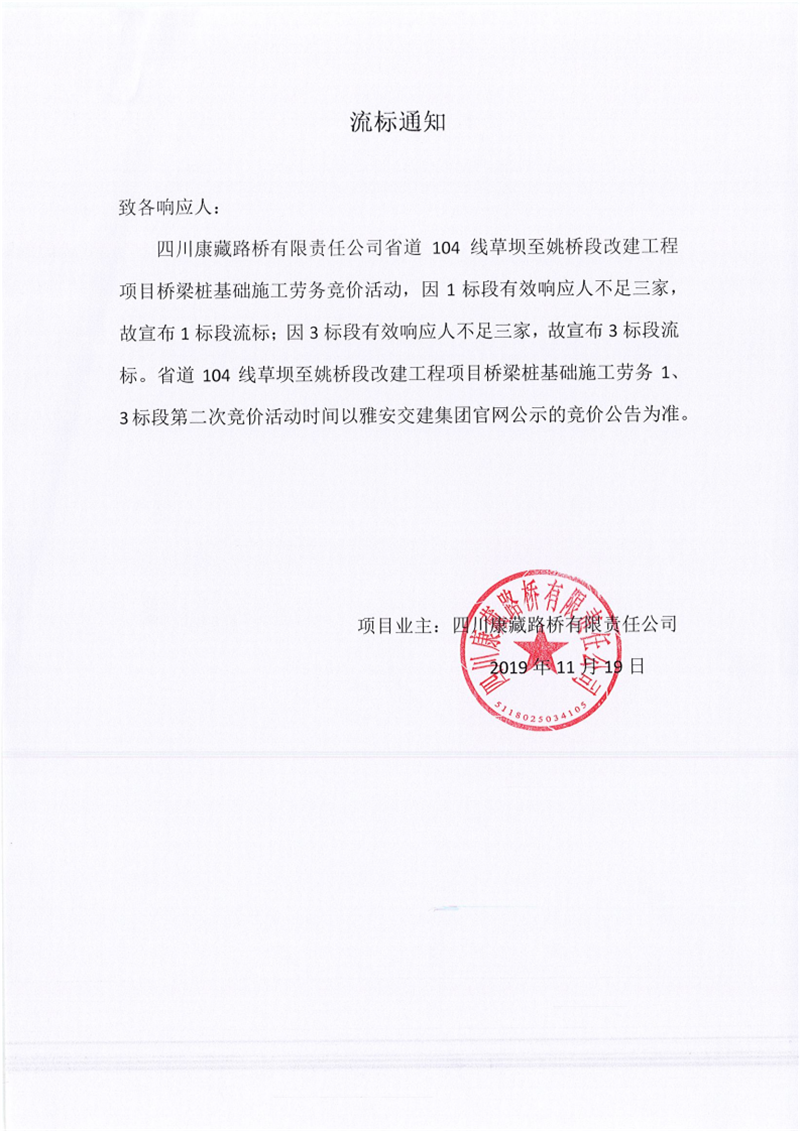 四川康藏路橋有限責(zé)任公司省道104線草壩至姚橋段改建工程項目橋梁樁基礎(chǔ)施工勞務(wù)競價(1標段、3標段)流標通知