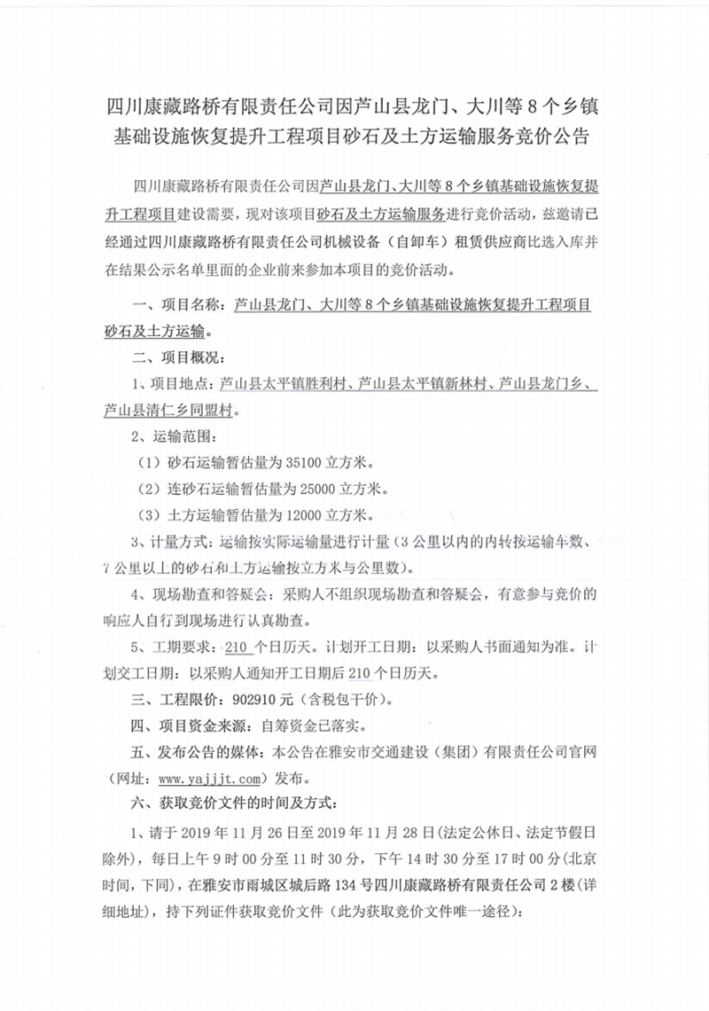 四川康藏路橋有限責任公司蘆山縣龍門、大川等8個鄉(xiāng)鎮(zhèn)基礎(chǔ)設(shè)施恢復提升工程項目砂石及土方運輸服務競價公告