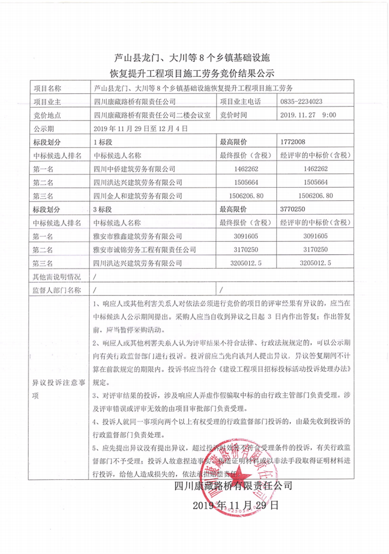 四川康藏路橋有限責(zé)任公司蘆山縣龍門(mén)、大川等8個(gè)鄉(xiāng)鎮(zhèn)基礎(chǔ)設(shè)施恢復(fù)提升工程項(xiàng)目施工勞務(wù)競(jìng)價(jià)結(jié)果公示