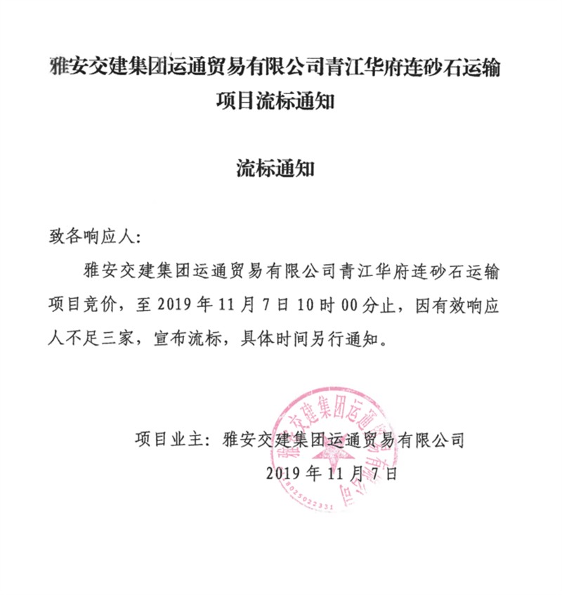 雅安交建集團運通貿(mào)易有限公司青江華府砂石運輸項目流標(biāo)通知
