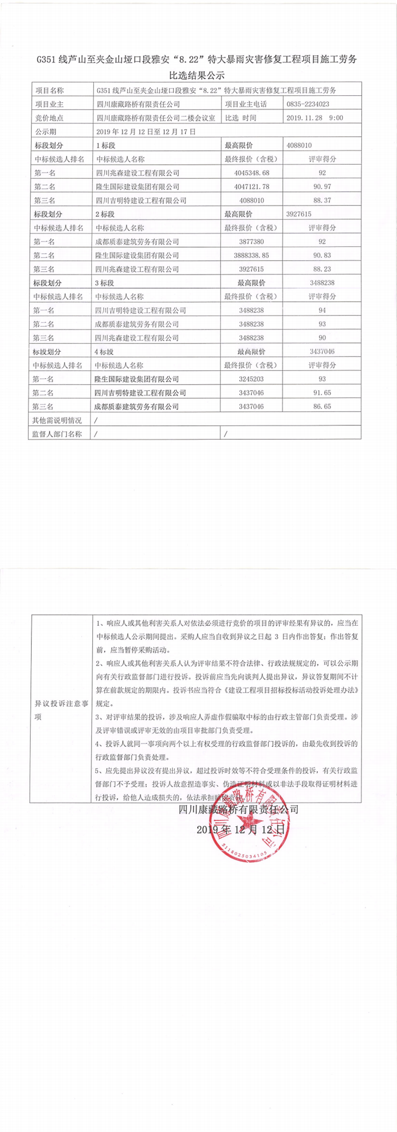 四川康藏路橋有限責任公司G351線蘆山至夾金山埡口段雅安“8.22”特大暴雨災害修復工程項目施工勞務比選結(jié)果公示