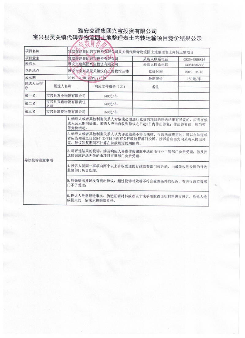 雅安交建集團興寶投資有限公司寶興縣靈關鎮(zhèn)代碑寺物流園土地整理表土內轉運輸項目競價結果公示