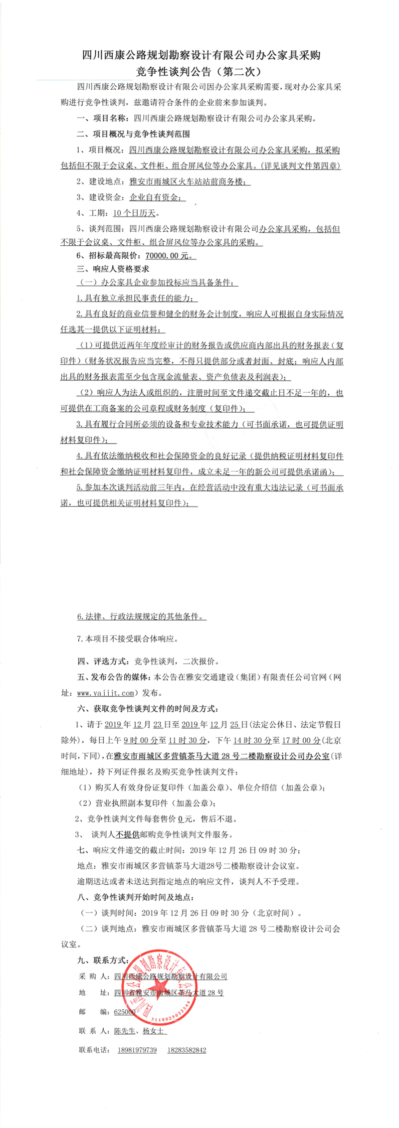 四川西康公路規(guī)劃勘察設計有限公司辦公家具采購競爭性談判公告(第二次)