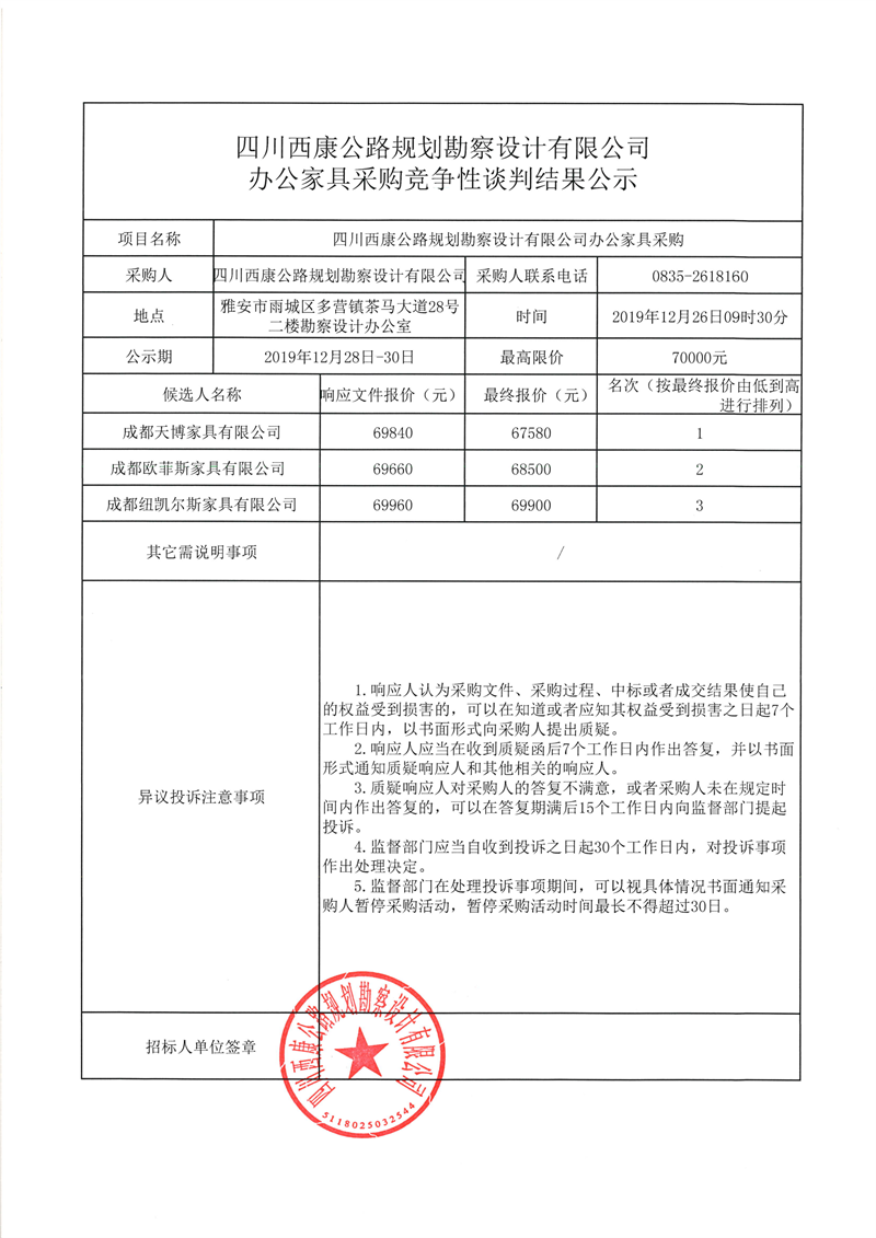 四川西康公路規(guī)劃勘察設(shè)計(jì)有限公司辦公家具采購(gòu)競(jìng)爭(zhēng)性談判結(jié)果公示