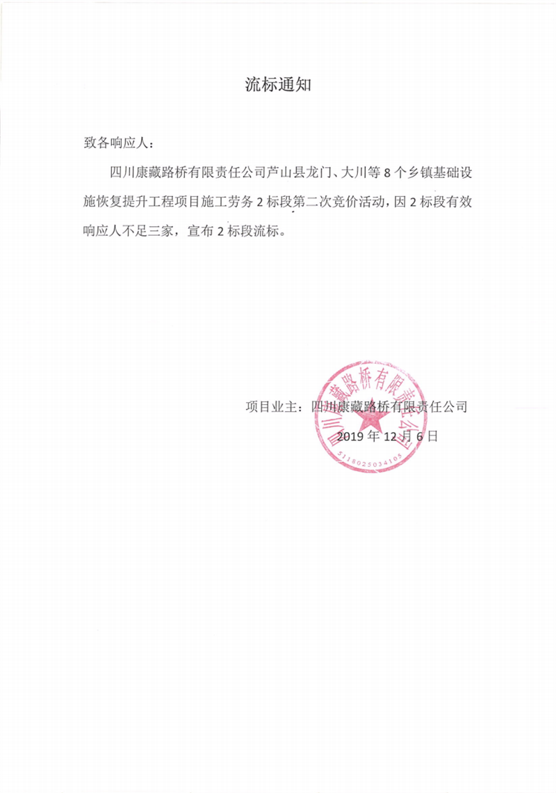 四川康藏路橋有限責任公司蘆山縣龍門、大川等8個鄉(xiāng)鎮(zhèn)基礎設施恢復提升工程項目施工勞務2標段第二次競價流標通知