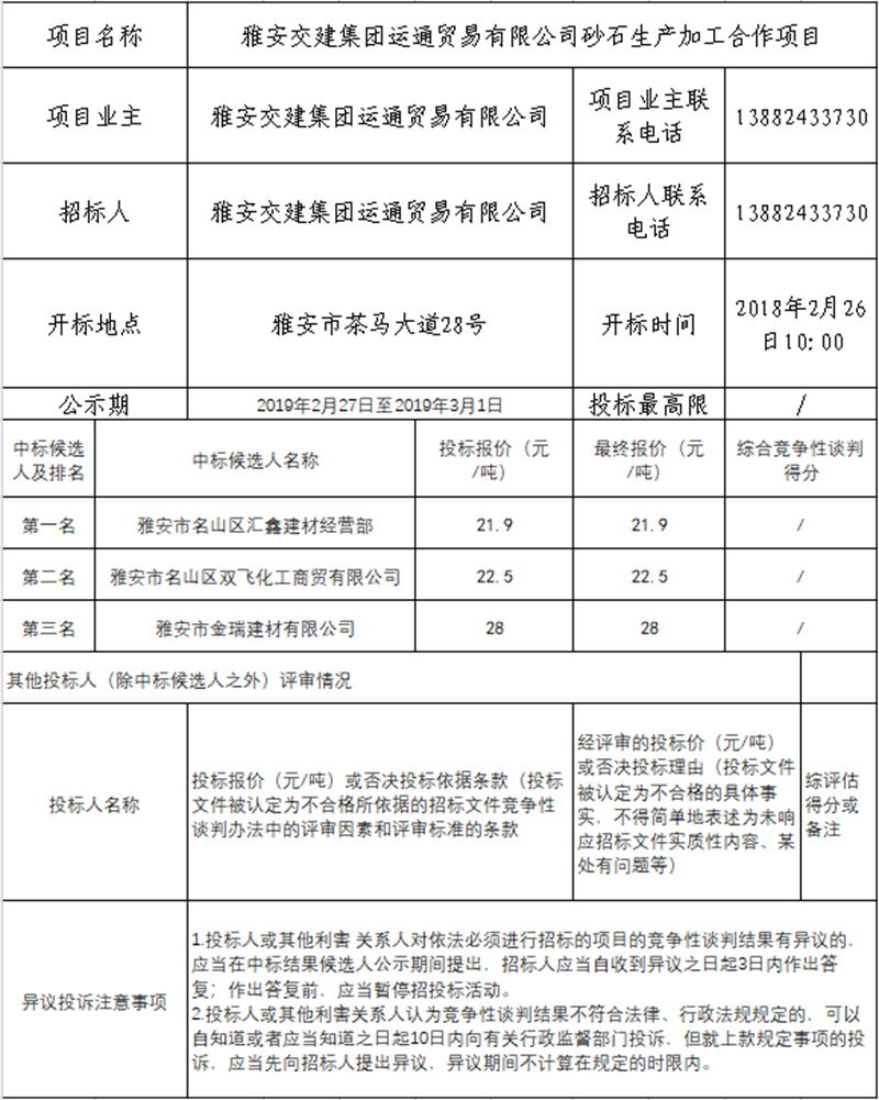 雅安交建集團(tuán)運(yùn)通貿(mào)易有限公司砂石生產(chǎn)加工合作項(xiàng)目競(jìng)爭(zhēng)性談判結(jié)果公示