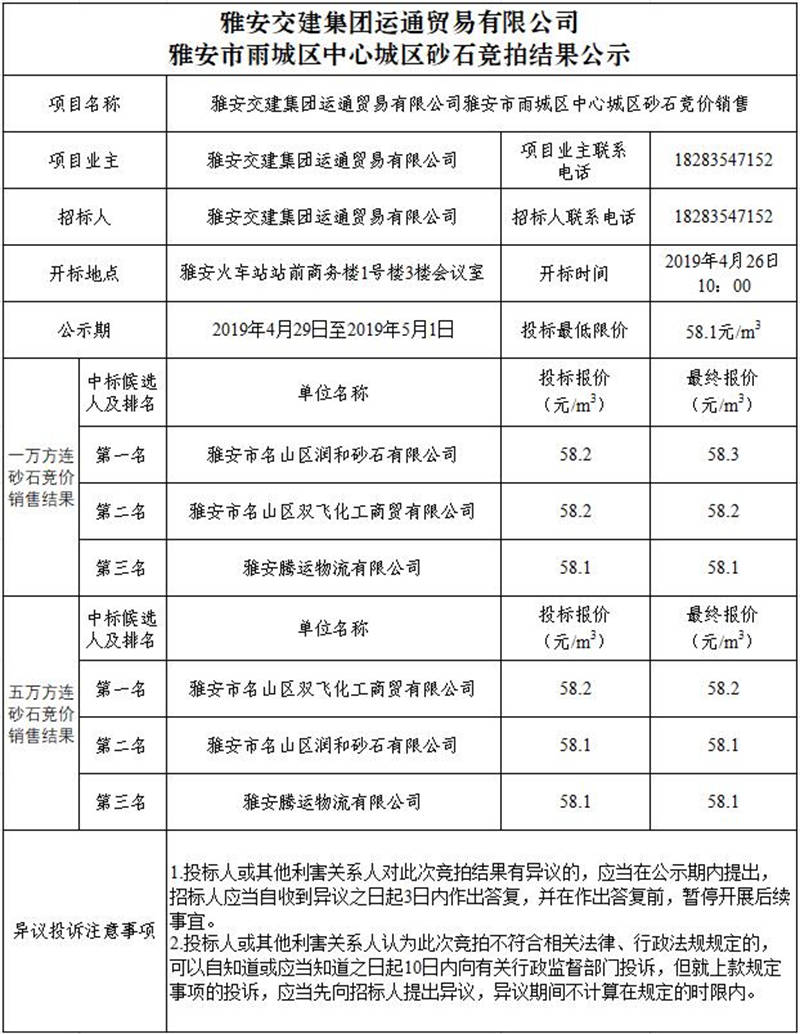 雅安交建集團(tuán)運(yùn)通貿(mào)易有限公司雨城區(qū)中心城區(qū)砂石競拍結(jié)果公示