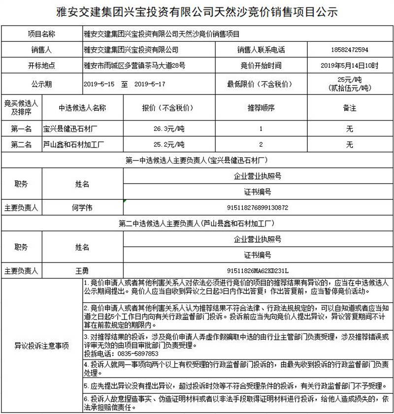 雅安交建集團興寶投資有限公司天然沙競價銷售項目公示