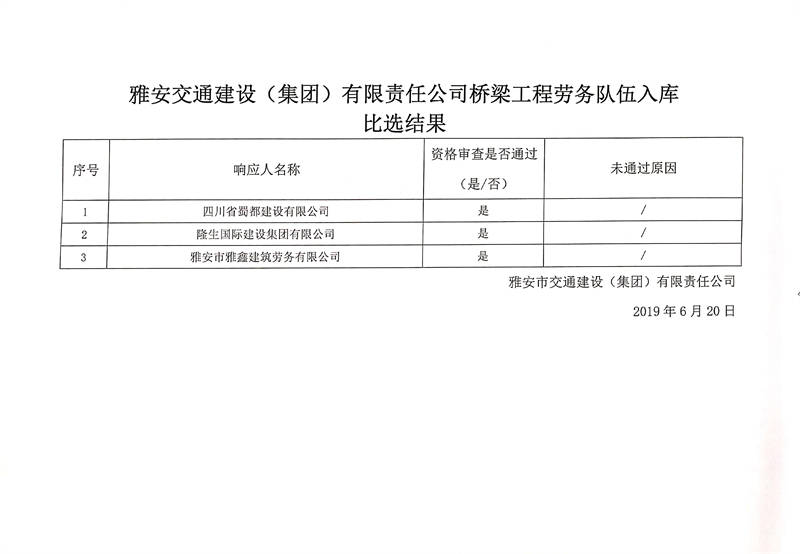 雅安交通建設(shè)(集團(tuán))有限責(zé)任公司橋梁工程勞務(wù)隊伍入庫比選結(jié)果