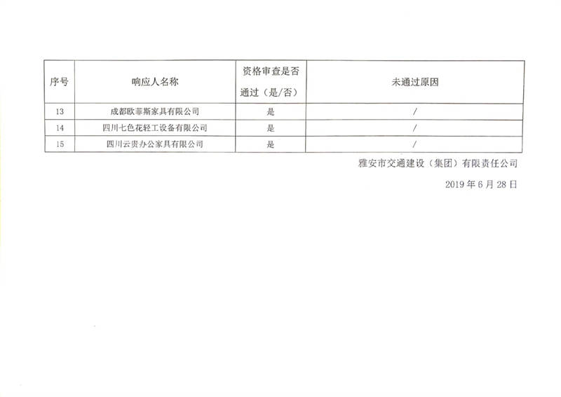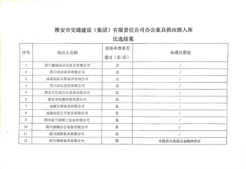 雅安市交通建設(shè)(集團(tuán))有限責(zé)任公司辦公家具供應(yīng)商入庫比選結(jié)果