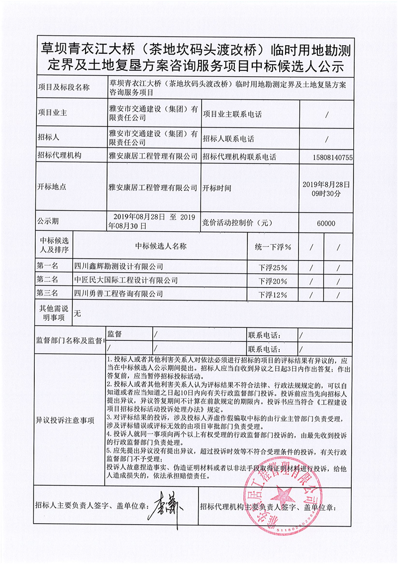 雅安市交通建設(shè)(集團(tuán))有限責(zé)任公司草壩青衣江大橋(茶地坎碼頭渡改橋)臨時(shí)用地勘測(cè)定界及土地復(fù)墾方案咨詢(xún)服務(wù)項(xiàng)目競(jìng)價(jià)結(jié)果公示