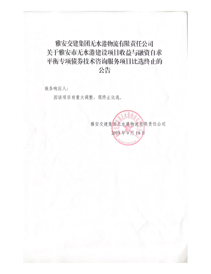 雅安交建集團(tuán)無(wú)水港物流有限責(zé)任公司關(guān)于雅安市無(wú)水港建設(shè)項(xiàng)目收益與融資自求平衡專(zhuān)項(xiàng)債券技術(shù)咨詢(xún)服務(wù)項(xiàng)目比選終止的公告