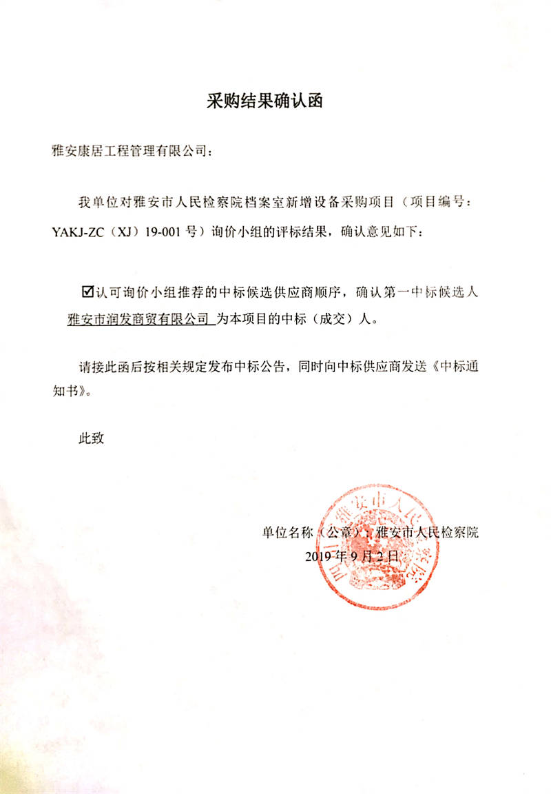 雅安市人民檢察院檔案室新增設備采購項目結(jié)果公示
