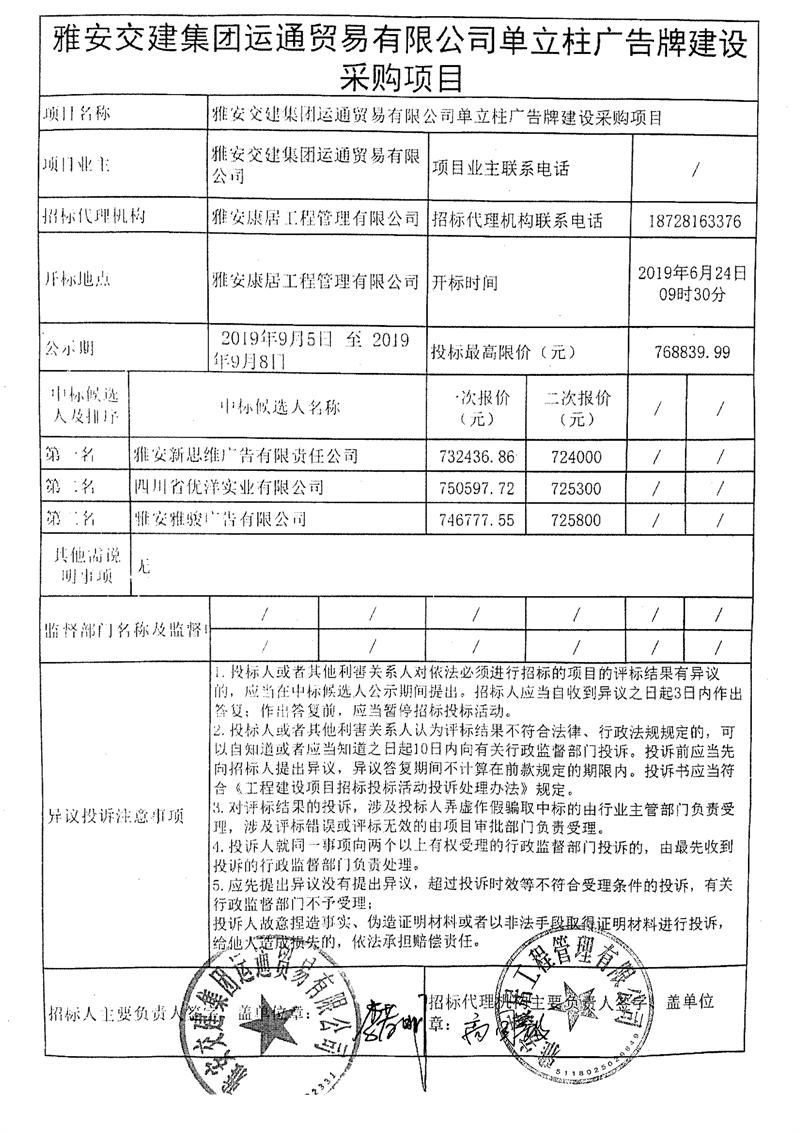 雅安交建集團運通貿(mào)易有限公司單立柱廣告牌建設(shè)采購項目競爭性談判結(jié)果公示