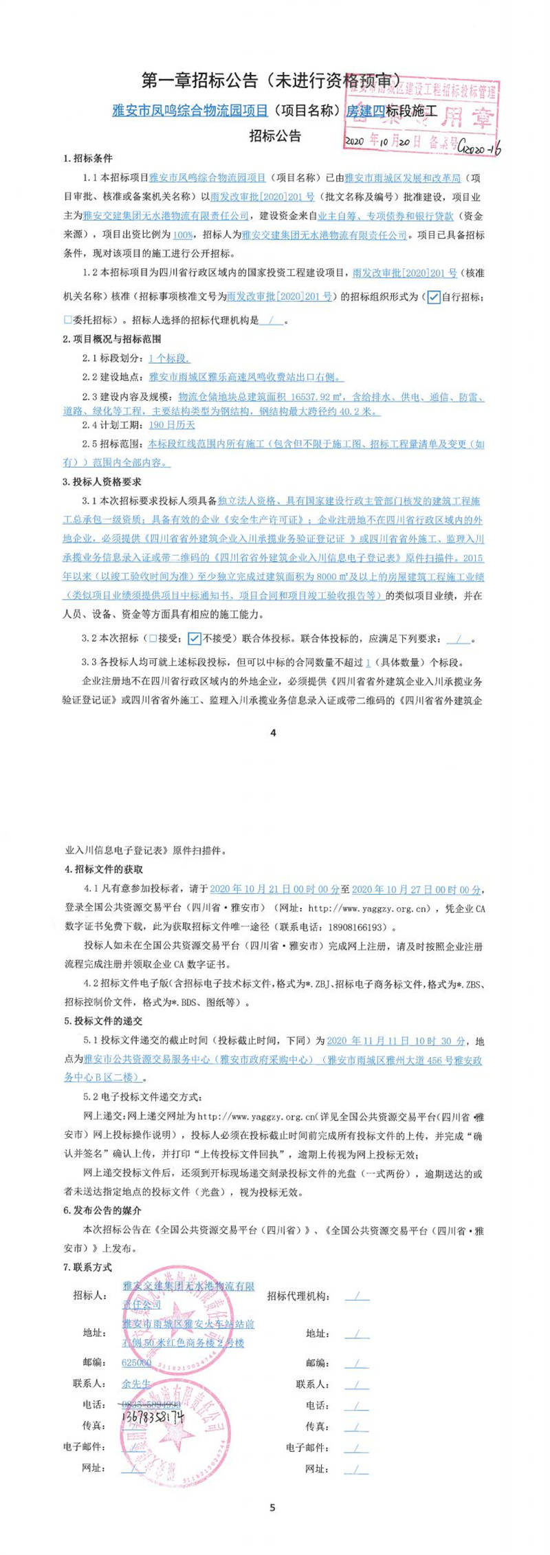 雅安交建集團無水港物流有限責(zé)任公司雅安市鳳鳴綜合物流園項目(項目名稱)房建四標(biāo)段施工招標(biāo)公告