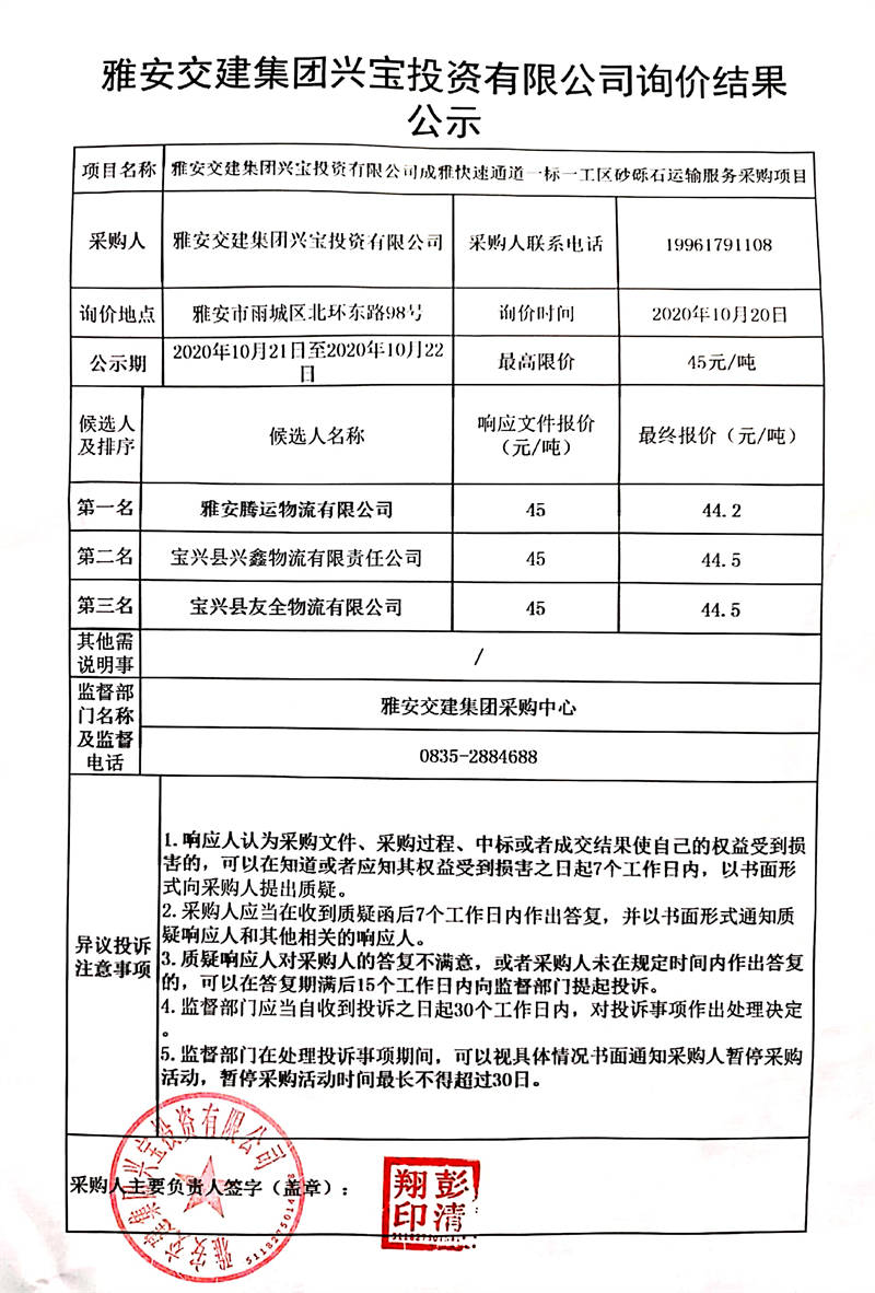 雅安交建集團(tuán)興寶投資有限公司成雅快速通道一標(biāo)一工區(qū)砂礫石運(yùn)輸服務(wù)采購(gòu)項(xiàng)目詢價(jià)結(jié)果公示
