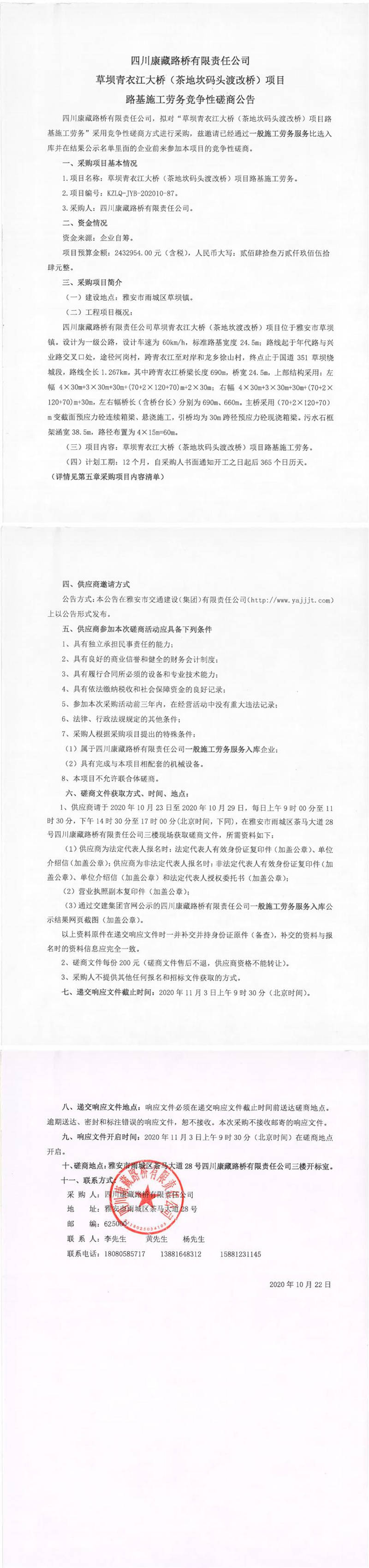 四川康藏路橋有限責(zé)任公司草壩青衣江大橋(茶地坎碼頭渡改橋)項(xiàng)目路基施工勞務(wù)競(jìng)爭(zhēng)性磋商公告