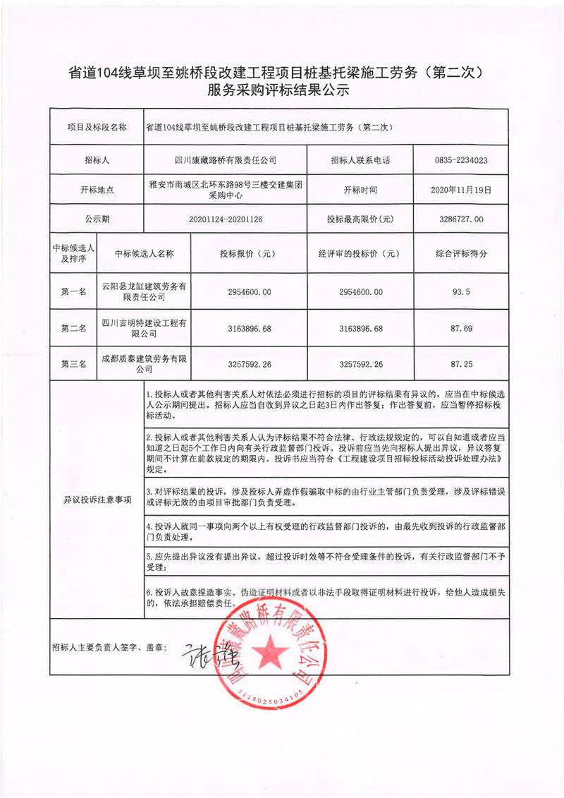 四川康藏路橋有限責(zé)任公司省道104線草壩至姚橋段改建工程項(xiàng)目樁基托梁施工勞務(wù)(第二次)服務(wù)采購評(píng)標(biāo)結(jié)果公示