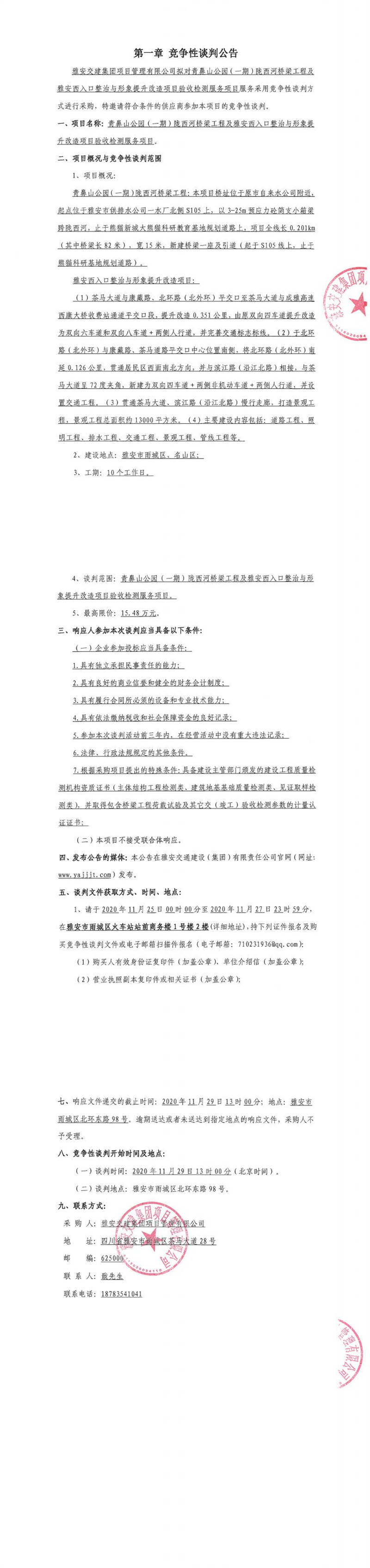 雅安交建集團(tuán)項(xiàng)目管理有限公司青鼻山公園(一期)隴西河橋梁工程及雅安西入口整治與形象提升改造項(xiàng)目驗(yàn)收檢測(cè)服務(wù)項(xiàng)目競爭性談判公告