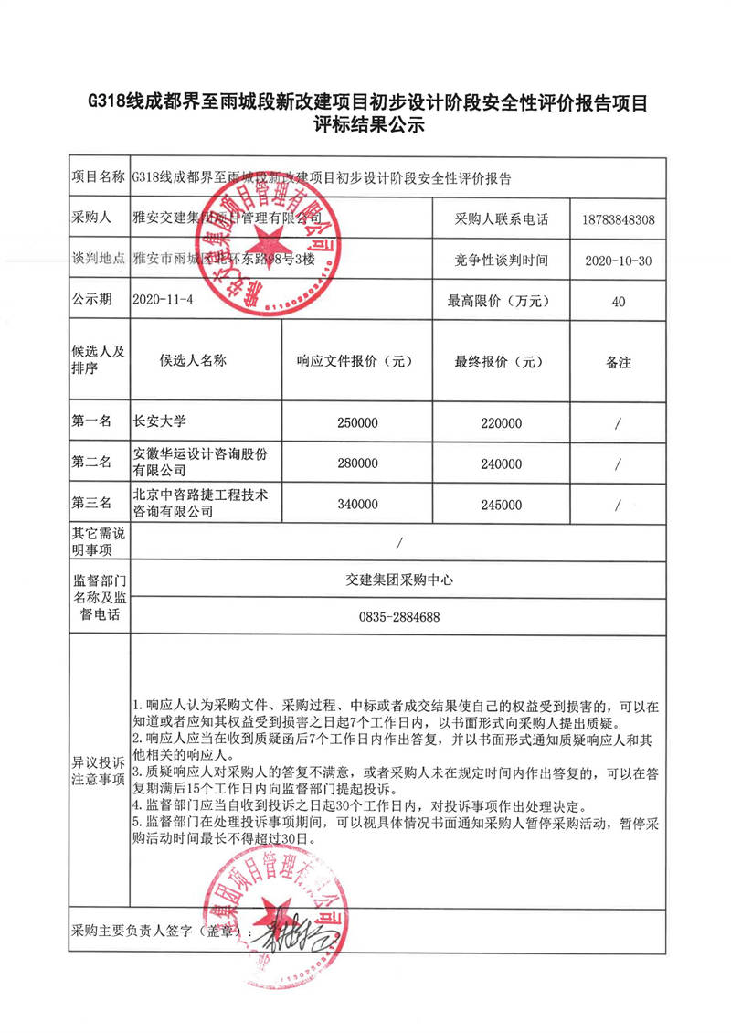 雅安交建集團項目管理有限公司G318線成都界至雨城段新改建項目初步設(shè)計階段安全性評價報告項目評標結(jié)果公示