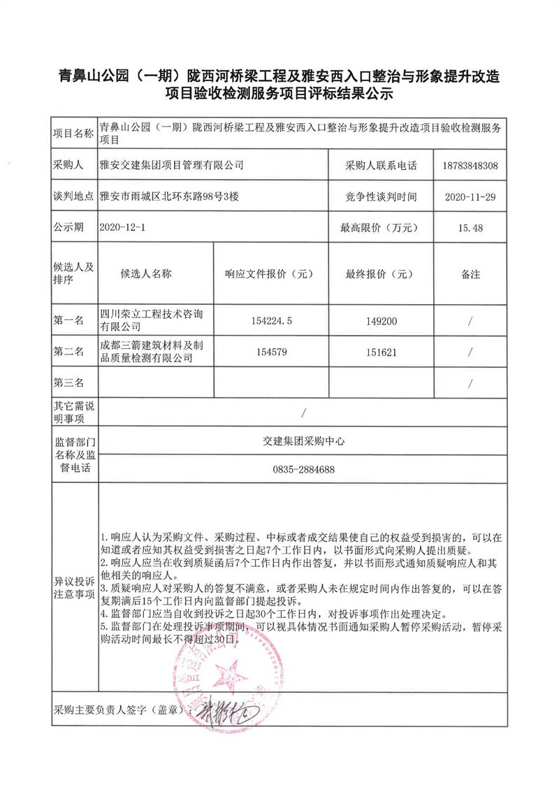 雅安交建集團(tuán)項(xiàng)目管理有限公司青鼻山公園(一期)隴西河橋梁工程及雅安西入口整治與形象提升改造項(xiàng)目驗(yàn)收檢測(cè)服務(wù)項(xiàng)目評(píng)標(biāo)結(jié)果公示