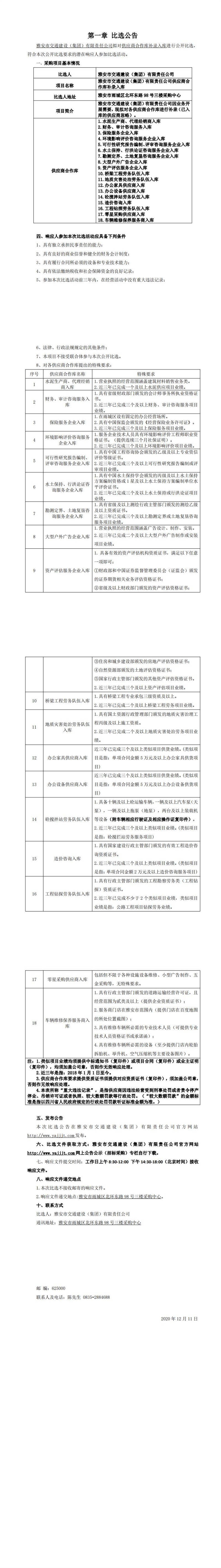 雅安市交通建設(shè)(集團)有限責任公司供應(yīng)商合作庫補錄入庫比選公告
