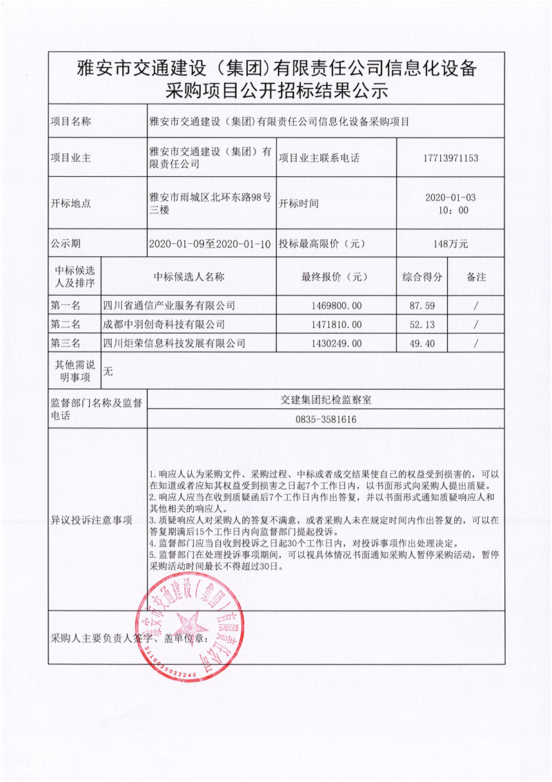 雅安市交通建設(集團)有限責任公司信息化設備采購項目公開招標結(jié)果公示