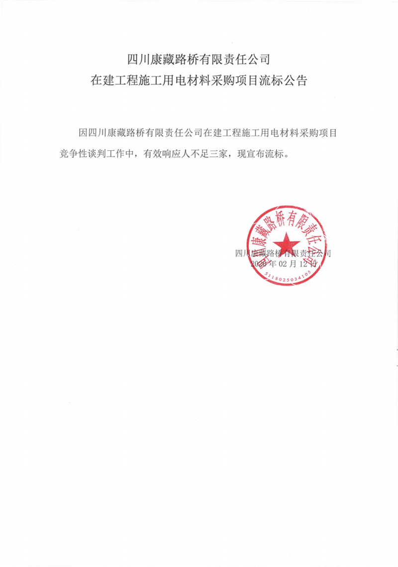 四川康藏路橋有限責任公司在建工程施工用電材料采購項目流標公告