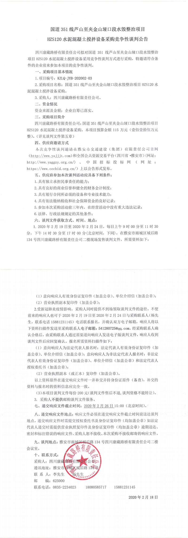 四川康藏路橋有限責(zé)任公司國(guó)道351線(xiàn)蘆山至夾金山埡口段水毀整治項(xiàng)目 HZS120水泥混凝土攪拌設(shè)備采購(gòu)競(jìng)爭(zhēng)性談判公告