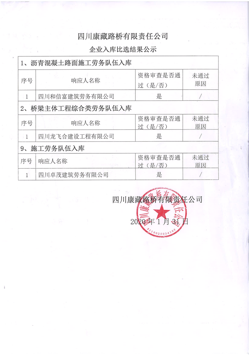 四川康藏路橋有限責任公司企業(yè)入庫比選結果公示
