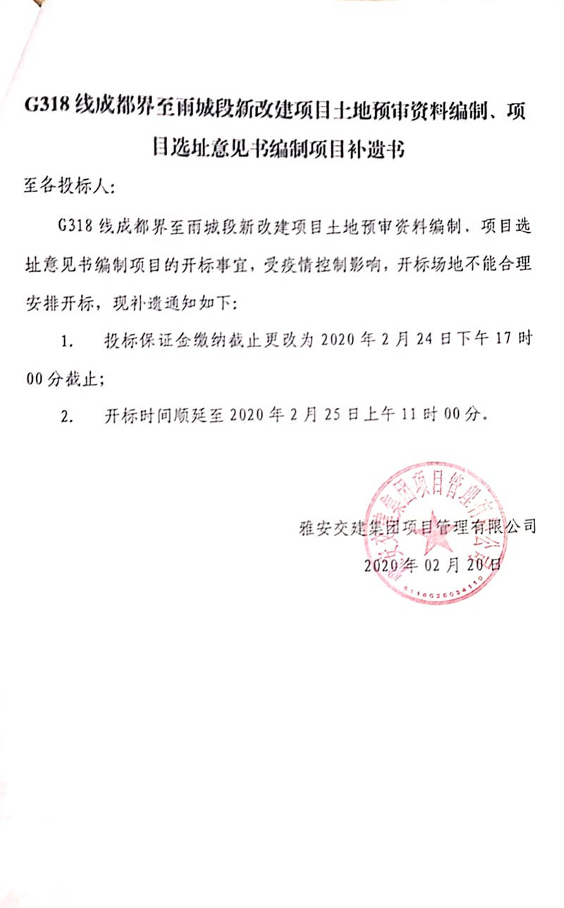 雅安交建集團(tuán)項目管理有限公司G318線成都界至雨城段新改建項目土地預(yù)審資料編制、項目選址意見書編制項目補(bǔ)遺書
