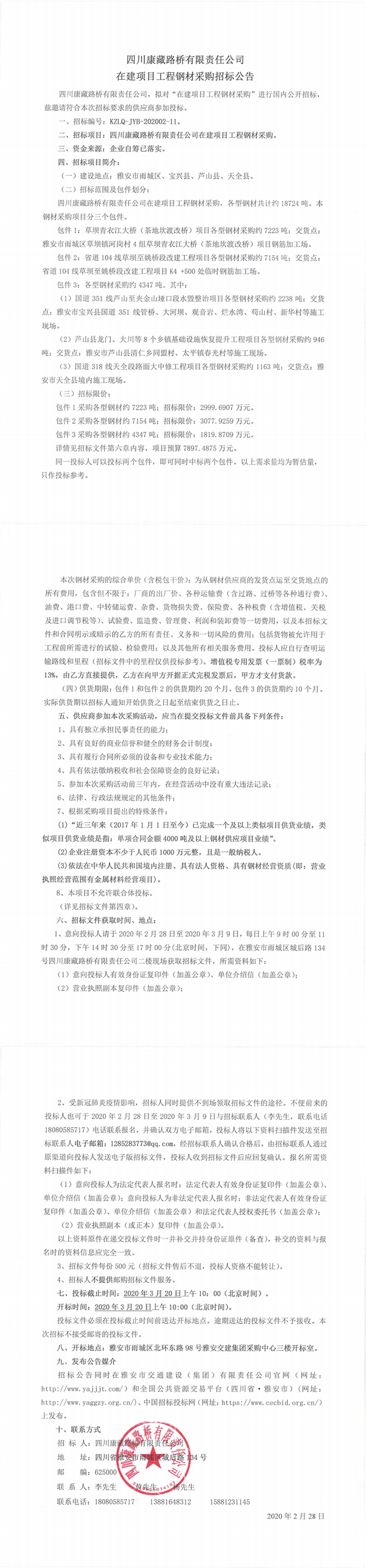 四川康藏路橋有限責(zé)任公司在建項(xiàng)目工程鋼材采購招標(biāo)公告