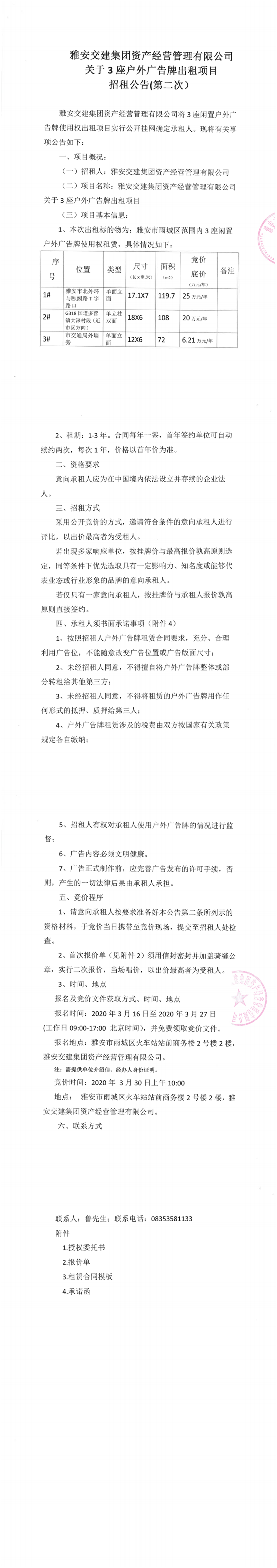 雅安交建集團(tuán)資產(chǎn)經(jīng)營管理有限公司關(guān)于3座戶外廣告牌出租項目招租公告(第二次)