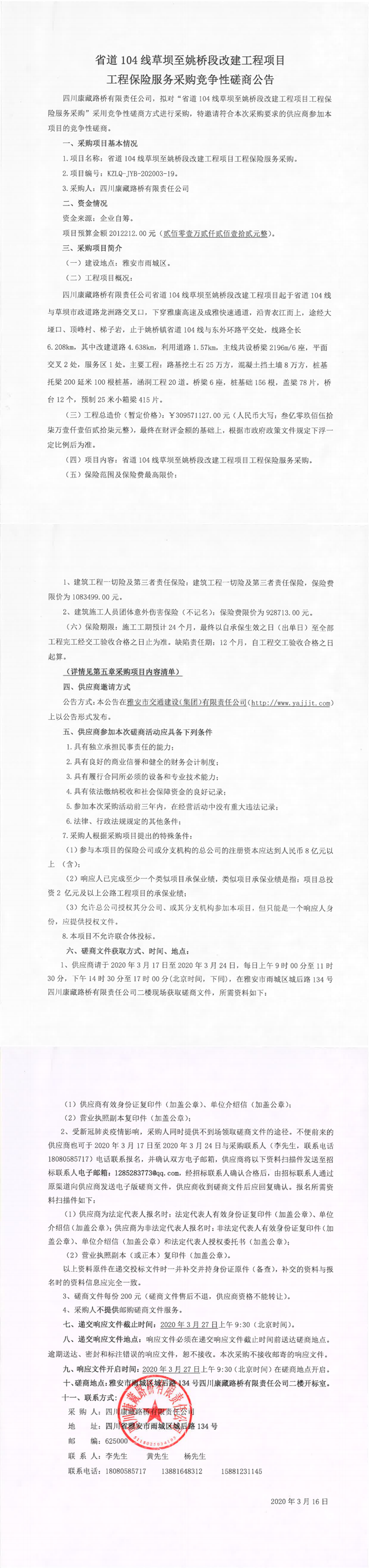 四川康藏路橋有限責任公司草壩青衣江大橋(茶地坎渡改橋)項目工程保險服務采購競爭性磋商公告