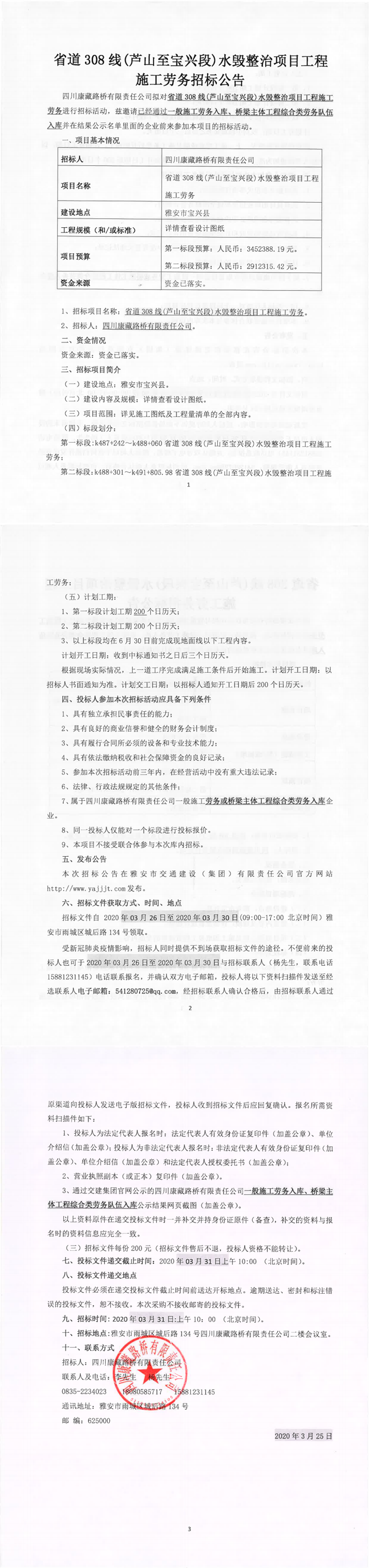 四川康藏路橋有限責任公司省道308線(蘆山至寶興段)水毀整治項目工程施工勞務招標公告