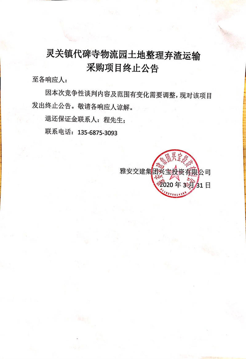 雅安交建集團興寶投資有限公司靈關鎮(zhèn)代碑寺物流園土地整理棄渣運輸采購項目終止公告