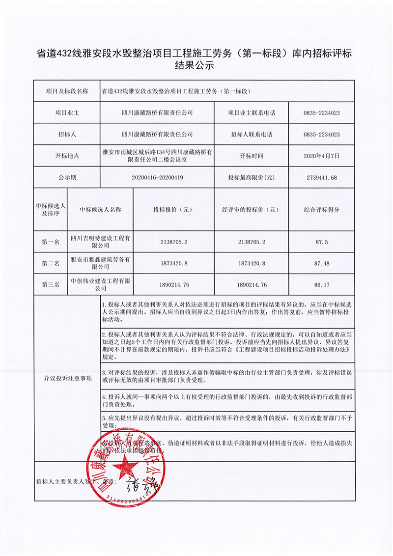 四川康藏路橋有限責任公司省道432線雅安段水毀整治項目工程施工勞務(第一標段)庫內招標評標結果公示