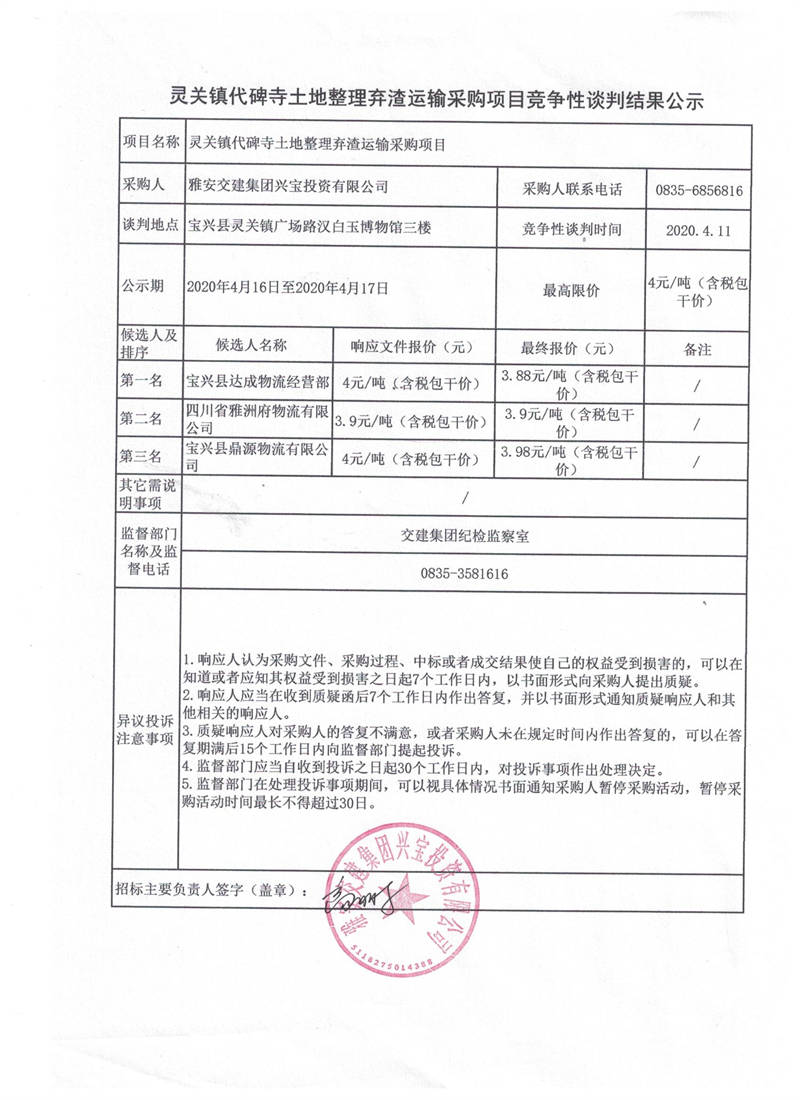雅安交建集團興寶投資有限公司靈關鎮(zhèn)代碑寺土地整理棄渣運輸采購項目競爭性談判結果公示