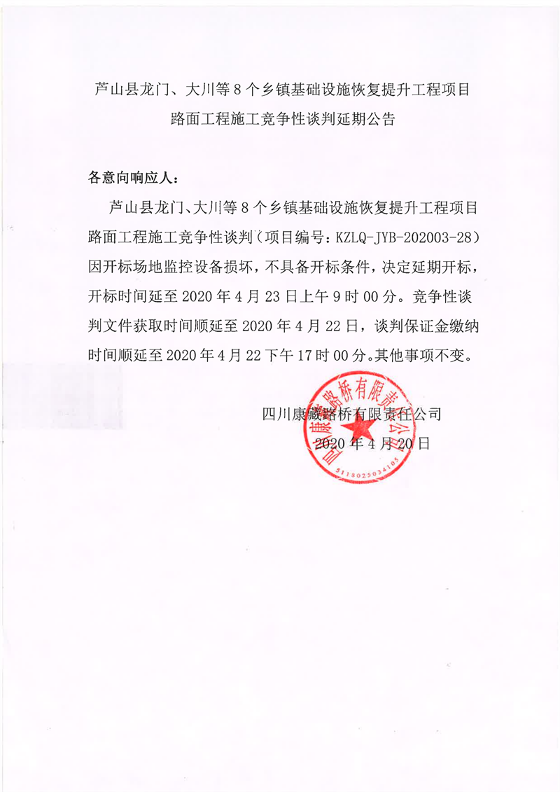 四川康藏路橋有限責(zé)任公司蘆山縣龍門、大川等8個(gè)鄉(xiāng)鎮(zhèn)基礎(chǔ)設(shè)施恢復(fù)提升工程項(xiàng)目路面工程施工競(jìng)爭(zhēng)性談判延期公告