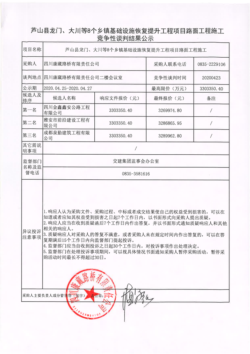 四川康藏路橋有限責任公司蘆山縣龍門、大川等8個鄉(xiāng)鎮(zhèn)基礎設施恢復提升工程項目路面工程施工競爭性談判結果公示
