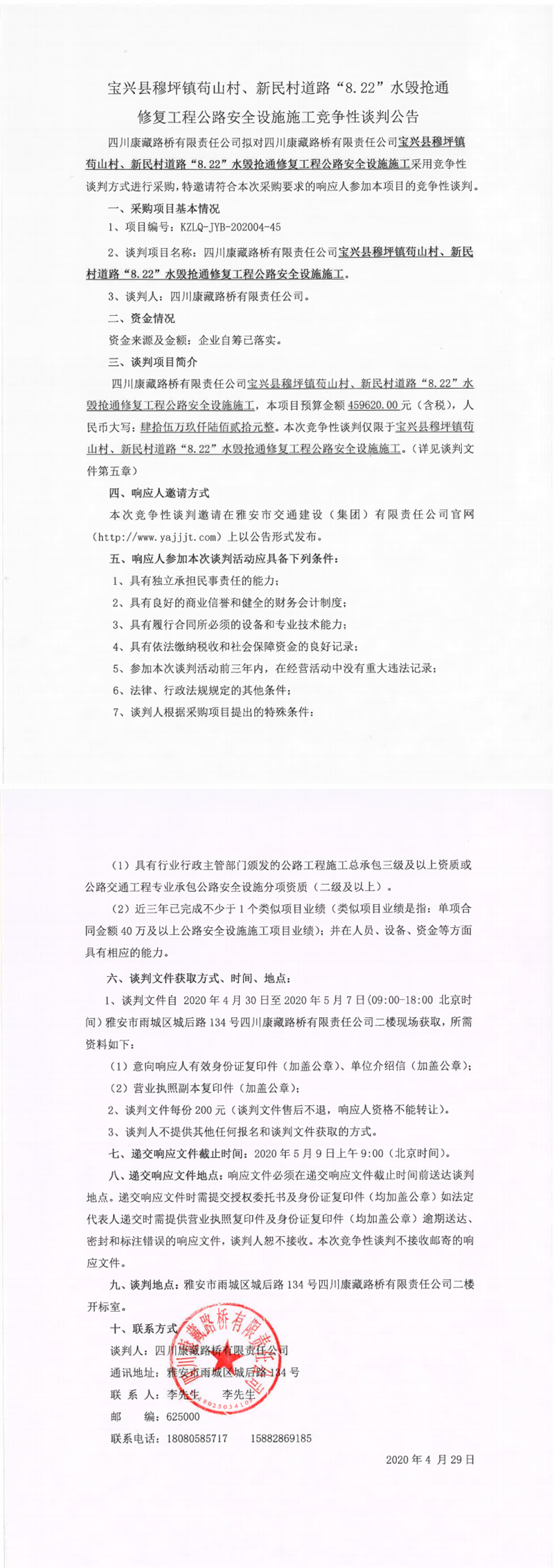 四川康藏路橋有限責任公司寶興縣穆坪鎮(zhèn)茍山村、新民村道路“8.22”水毀搶通修復工程公路安全設(shè)施施工競爭性談判公告