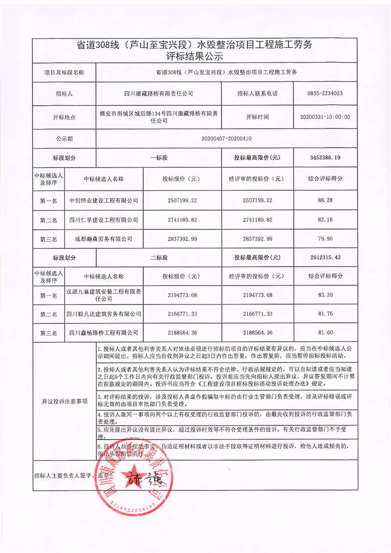 四川康藏路橋有限責任公司省道308線(蘆山至寶興段)水毀整治項目工程施工勞務評標結(jié)果公示