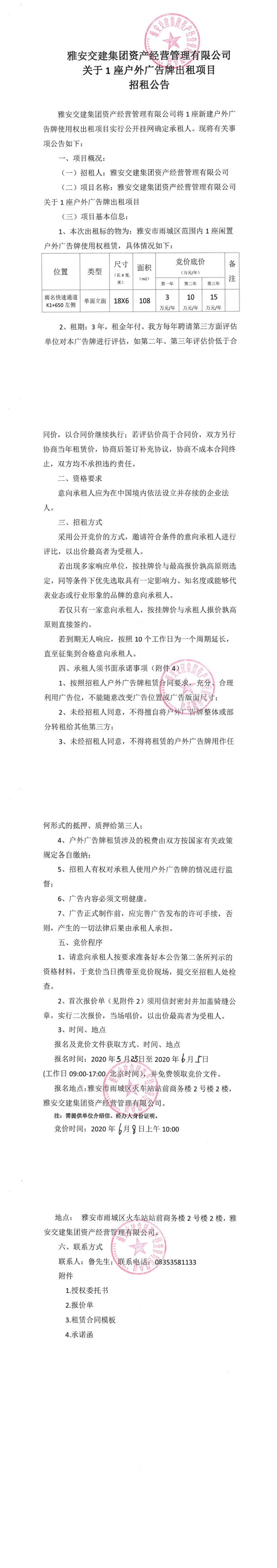 雅安交建集團(tuán)資產(chǎn)經(jīng)營(yíng)管理有限公司關(guān)于1座戶外廣告牌出租項(xiàng)目招租公告